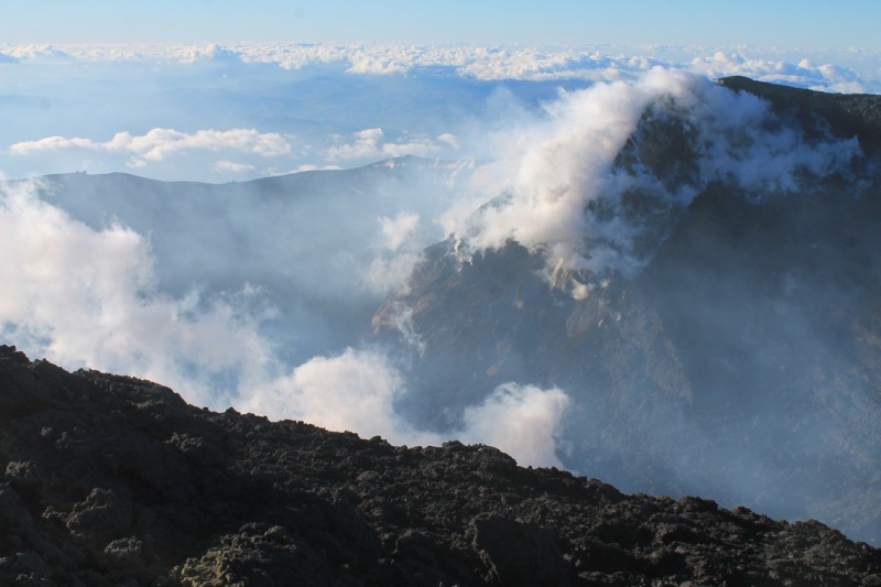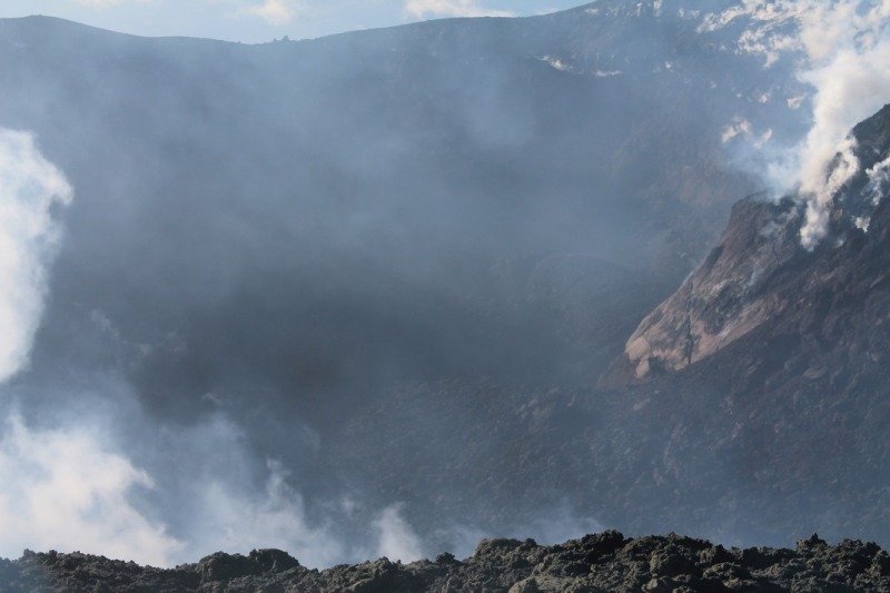 Auf dem Sattel zwischen dem alten und dem Neuen Südostkrater. Blick nach West/Nordwest auf dampfende Fumarolen am alten Südostkrater. Rechts dahinter der mit reichlich pyroklastischem Material überzogene Zentralkraterkegel.
