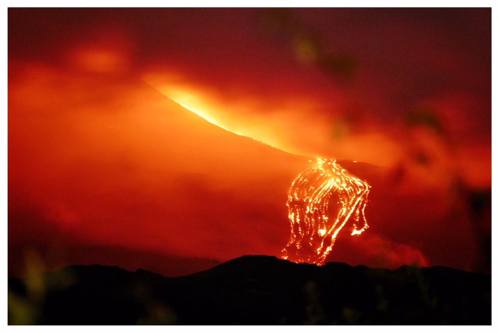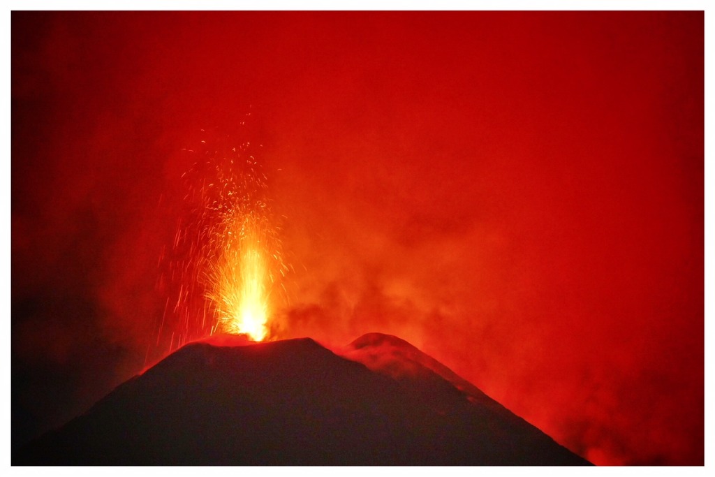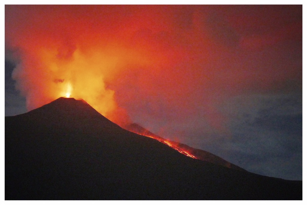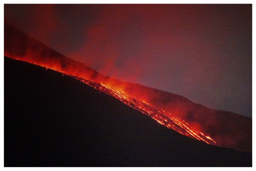 Am Morgen des 23. August konnte ich über die Webcams verstärkte Gasemission am Sattelkegel des Südostkraterkomplexes, auf dem Grat zwischen altem und neuem Südostkrater, beobachten. Rasch zogen jedoch Wolken auf und erst am Nachmittag lockerte es etwas auf. Nun war über die Montagnola-Wärmebildkamera des INGV eine deutliche thermische Anomalie im Gebiet des Sattelkegels erkennbar. Diese intensivierte sich rasch und mit zunehmender Dunkelheit zeigte sich pulsierender Glutschein am Sattelkegel. Er wurde von milder, jedoch anhaltender strombolianischer Aktivität verursacht. Die glühenden Fragmente wurden dabei von einem Schlot am Sattelkegel wenige zig Meter hoch geschleudert. Im Laufe des Abends steigerte sich die eruptive Aktivität weiter und das glühende Material stieg mind. 100 m hoch auf bevor es auf die Umgebung des Sattelkegels niederging. Gegen 20:30 Uhr erschien an der oberen Ostflanke des Neuen Südostkraters dann ein kleiner Lavastrom. Er wurde offenbar von einem neuen Schlot emittiert der sich knapp unterhalb des Kollapskraters geöffnet hatte. Wenig später war dann an der Nordflanke des Südostkraterkomplexes, unterhalb des Sattelkegels, ein kurzer Lavastrom erkennbar. Er wurde offenbar direkt aus dem aktiven Schlot des Sattelkegels genährt.