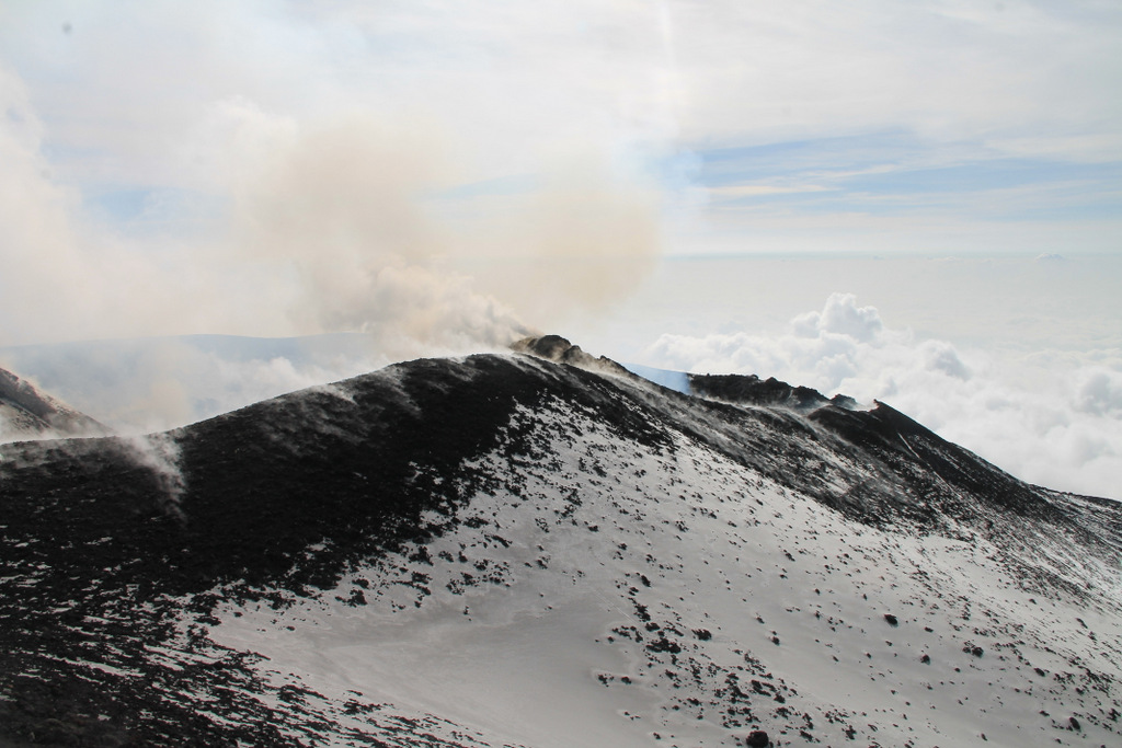 Schlechtes Wetter mit Neuschnee behinderte in der vergangenen Woche zeitweise die Beobachtung des Gipfelbereichs mittels Webcams. Während den wolkenfreien Phasen zeigte sich weiterhin kräftige pulsartige Gasemission aus der Bocca Nuova. In den Nächten war häufig leichter Glutsschein über der Bocca Nuova erkennbar. Am Nordostkrater waren die Gasemissionen gering und Aschefreisetzungen konnte ich dort nicht beobachten.