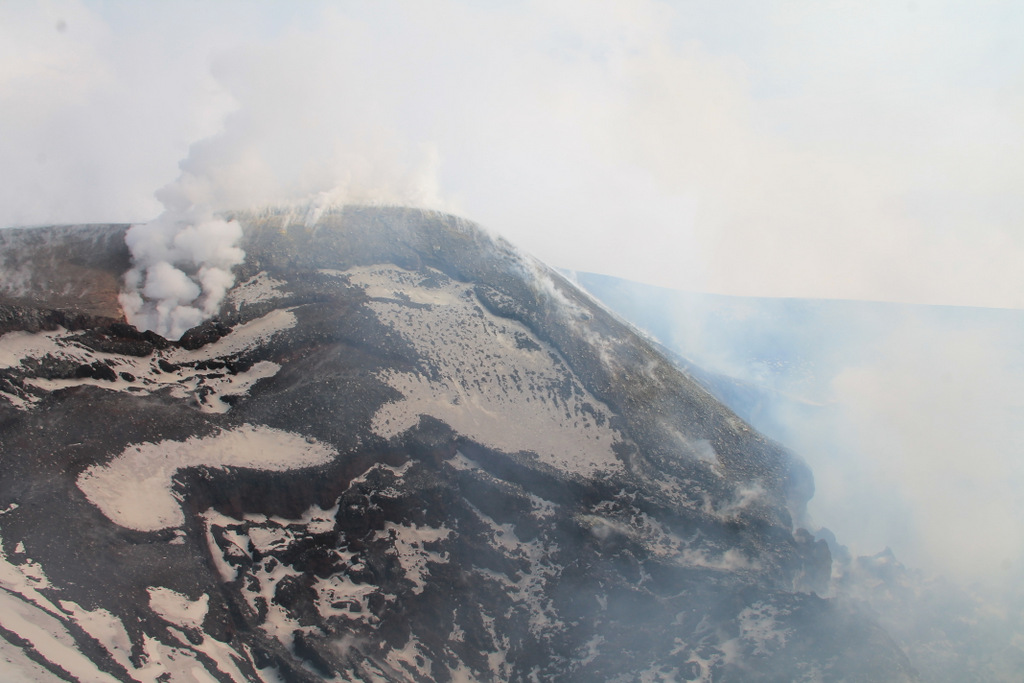 Am Neuen Südostkrater nahmen die Gas- bzw. Dampfemissionen im Gipfelbereich, sowie am Sattelkegel etwas zu und waren anhaltend. Auch die Schlote an der eruptiven Spalte vom 24.12. setzen etwas weißen Dampf frei. Ein Schlot an der anderen eruptiven Spalte, die sich am 24.12. zwischen Neuem Südostkrater und Nordostkrater gebildet hatte, setzte ebenfalls weißen Dampf frei. Interessant war eine Linie bestehend aus kleinen Wasserdampffahnen die sich von diesem Schlot aus in nördliche Richtung zog und knapp unterhalb der Schlackenkegel von 2014 verlief. Möglicherweise handelt es sich hierbei um eine Fortsetzung der eruptiven Spalte nach Norden.