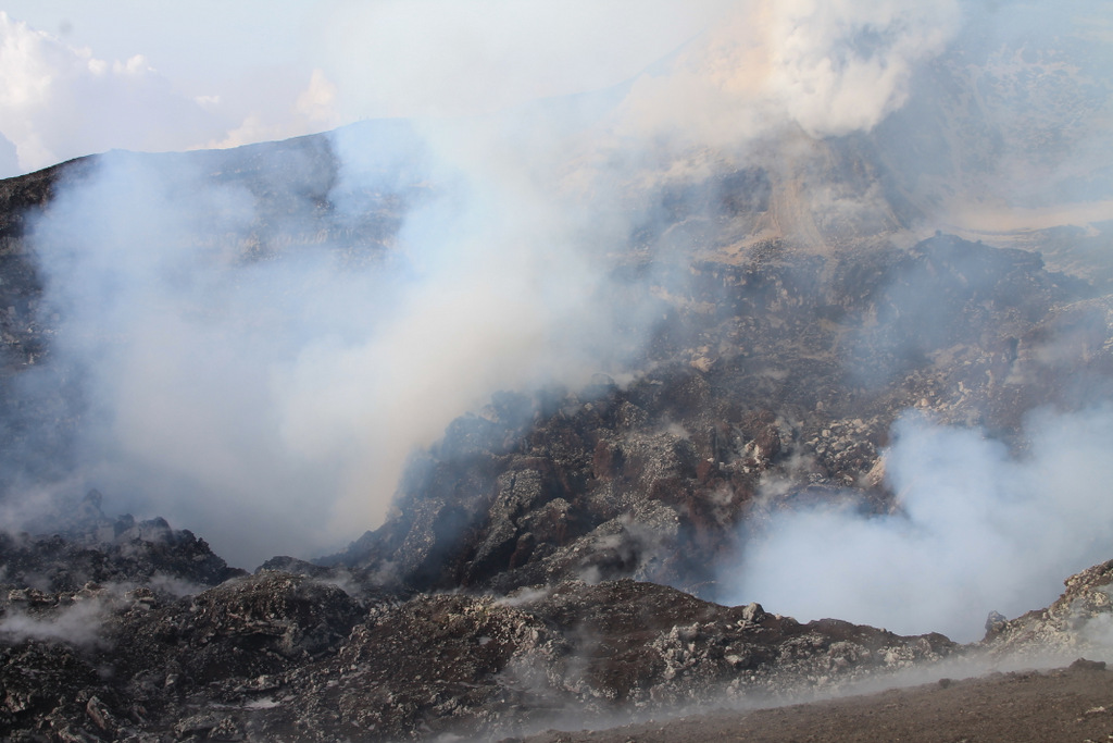 Blick vom nördlichen Rand des Nordostkraters nach Süden. Dort geht der Krater in einen Graben über der sich während der heftigen eruptiven Aktivität im Mai 2016 gebildet hatte.