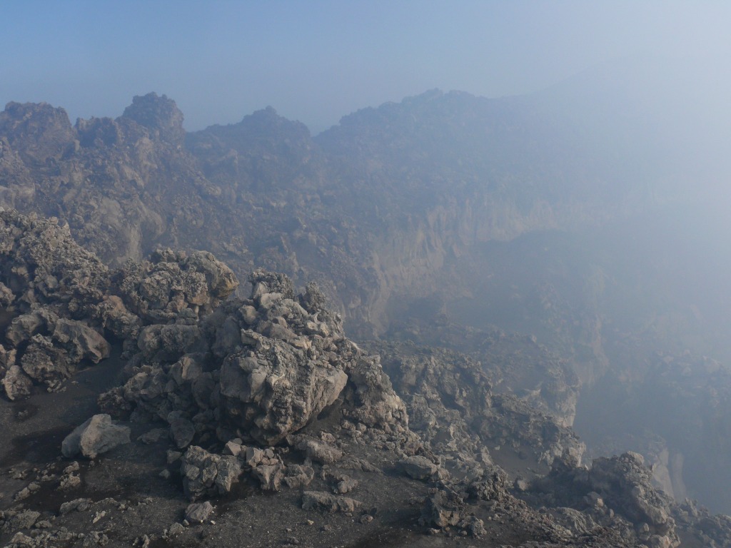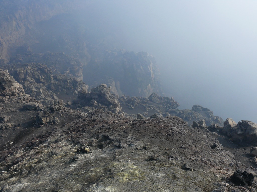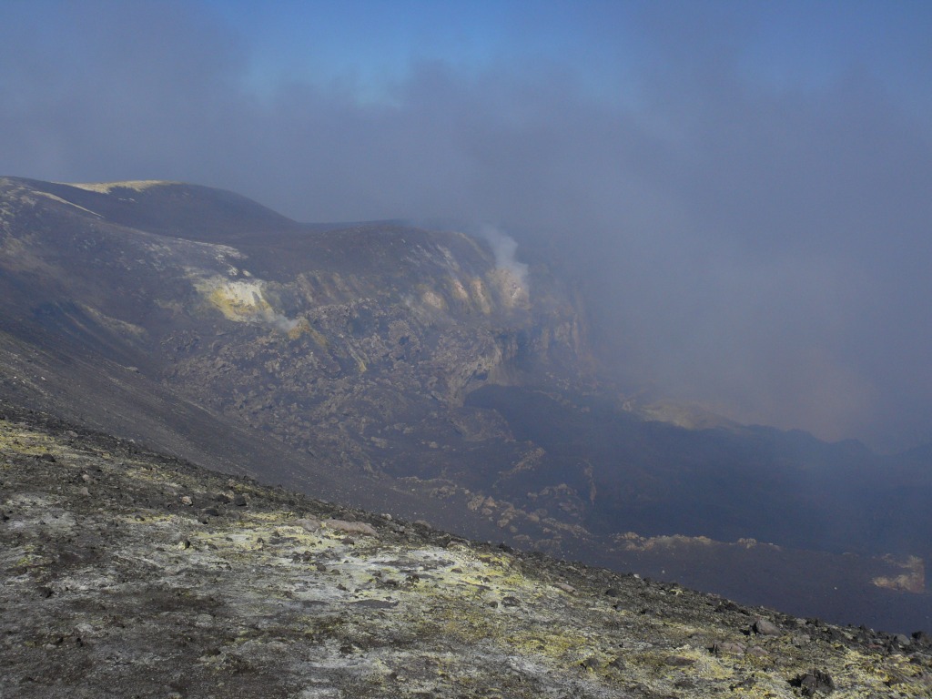 Stufenförmig geht die innere westliche Wand der Bocca Nuova zum Kraterboden über, der aber auf Grund von Gas nicht einsehbar ist.