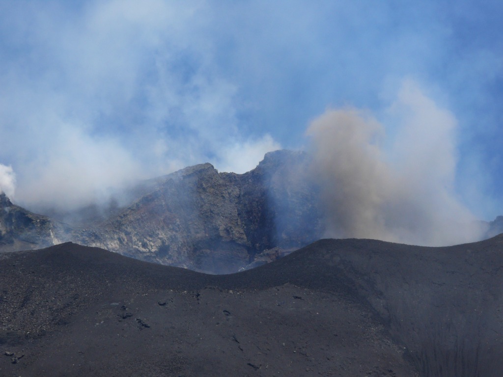 Blick vom La Montagnola auf den Südostkraterkomplex. Begleitet von lautem Fauchen werden aus dem Sattelschlot nahezu anhaltend Dampf und Gas ausgestoßen, die mal mit mehr und mal mit weniger grauer Asche durchsetzt sind.