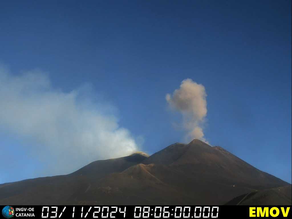 In der letzten Woche machten Wolken die Beobachtung der Gipfelkrater zunehmend schwer. Am Nordostkrater zeigte sich nur noch ganz sporadisch sehr schwacher Glutschein, der nur mit lichtstarken Webcams erkennbar war. Am Tage war dort pulsartig verstärkte Gasemission zu sehen. Der neue große Kegel der Voragine setzte anhaltend Dampf und Gas aus zahlreichen Fumarolen frei. Hinzu kam zeitweise verstärkte Gasemission, die manchmal mit etwas bräunlicher Asche durchsetzt war. Die Bocca Nuova setzte in ihrem nordwestlichen Abschnitt anhaltend etwas Gas frei. Am Südostkraterkomplex konzentrierten sich die Gasemissionen auf den nordöstlichen Gipfelbereich des Neuen Südostkraters. Wiederholt kam es dort auch zu meist kleinen Emissionen von bräunlicher Asche. Diese traten besonders am 03. November verstärkt auf.