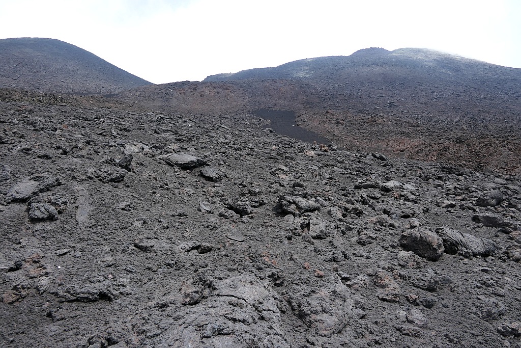 Von der Westflanke des Monte Barbagallo aus erkennt man die Geröllwüste aus unzähligen Lavaströmen, die das Gebiet nördlich des Monte Frumento Supino bedecken. Im Vordergrund relativ frische Lavaströme, die vermutlich vom April diesen Jahres stammen.