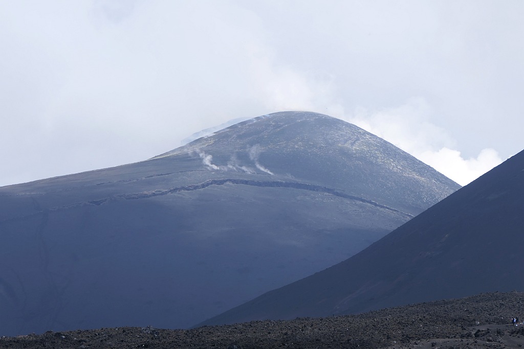 Blick vom Fahrweg unterhalb der Gipfelkrater auf die Westflanke des Zentralkraterkegels mit der Bocca Nuova. Die Lavaströme und das pyroklastische Material aus der Voragine vom Sommer 2024 haben die Bocca Nuova aufgefüllt und auch die Morphologie der Westflanke verändert.